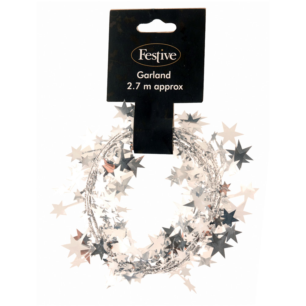 Julgirlang med Stjärnor Silver omfattar en silvrig julgirlang med stjärnor. Girlangen är tillverkad av plast och är ca 270 cm lång.