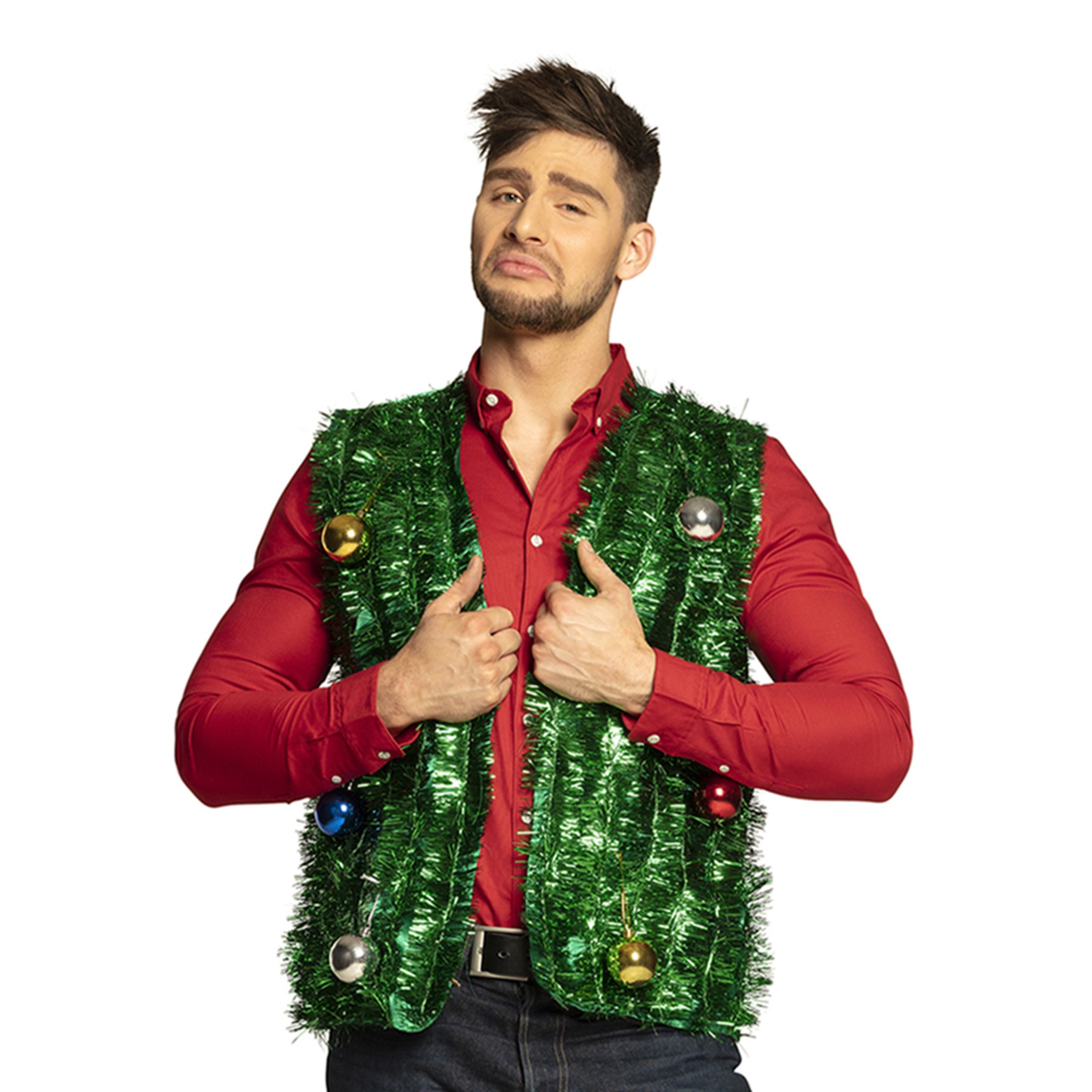 Julgran väst är tillverkad i polyester och plast och har storleken medium/ large. Passar perfekt på julfesten.
