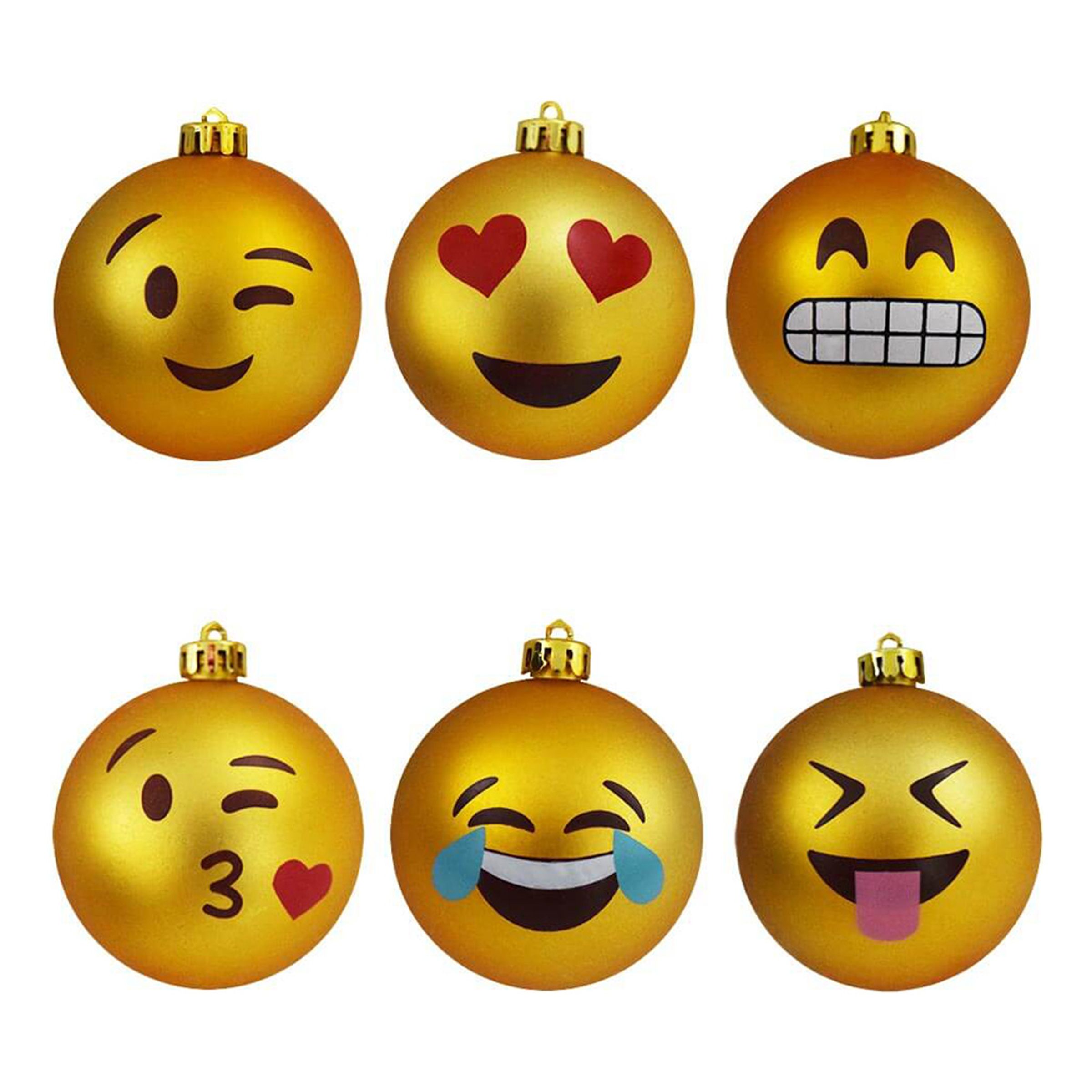 Julgranskulor Emoji kommer som ett 6-pack julgranskulor med sex välkända motiv av emojiansikten. Julgranskulorna har en guldig färg och hängs enkelt upp precis som vanliga julgranskulor.