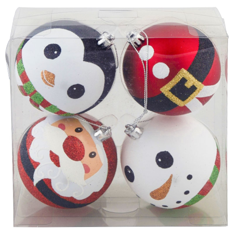 Julgranskulor Figurer omfattar fyra stycken stora julkulor med olika juliga glitter figurer. Kulorna är gjorda i plast och har en diameter på ungefär 7 centimeter. Säljes i 4-pack.