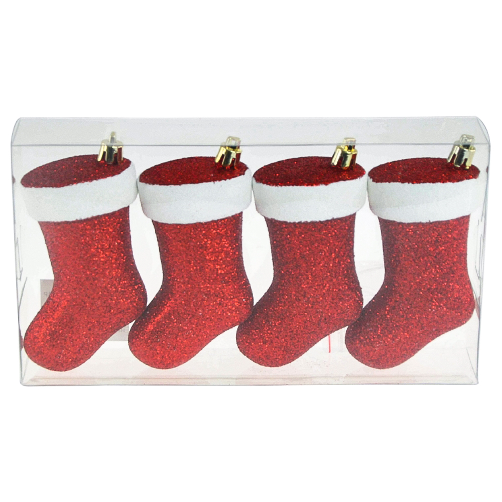 Julgranskulor Julstrumpor består av julgranshängen i form av glitter julstrumpor. Julstrumporna är gjorda i plast och mäter ungefär 9,5 centimeter höga. Säljs i 4-pack.
