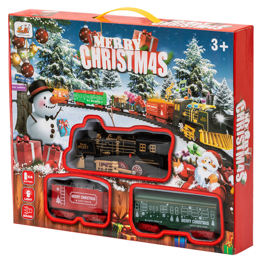 Julgranståg med Ljud och Ljus innehåller ett julgranståg med ett lok, 2 vagnar och ett tågräls i 8 delar som läggs runt julgranen. Julgranståget har både ljud och ljus samt praktiskt On/Off-knapp.