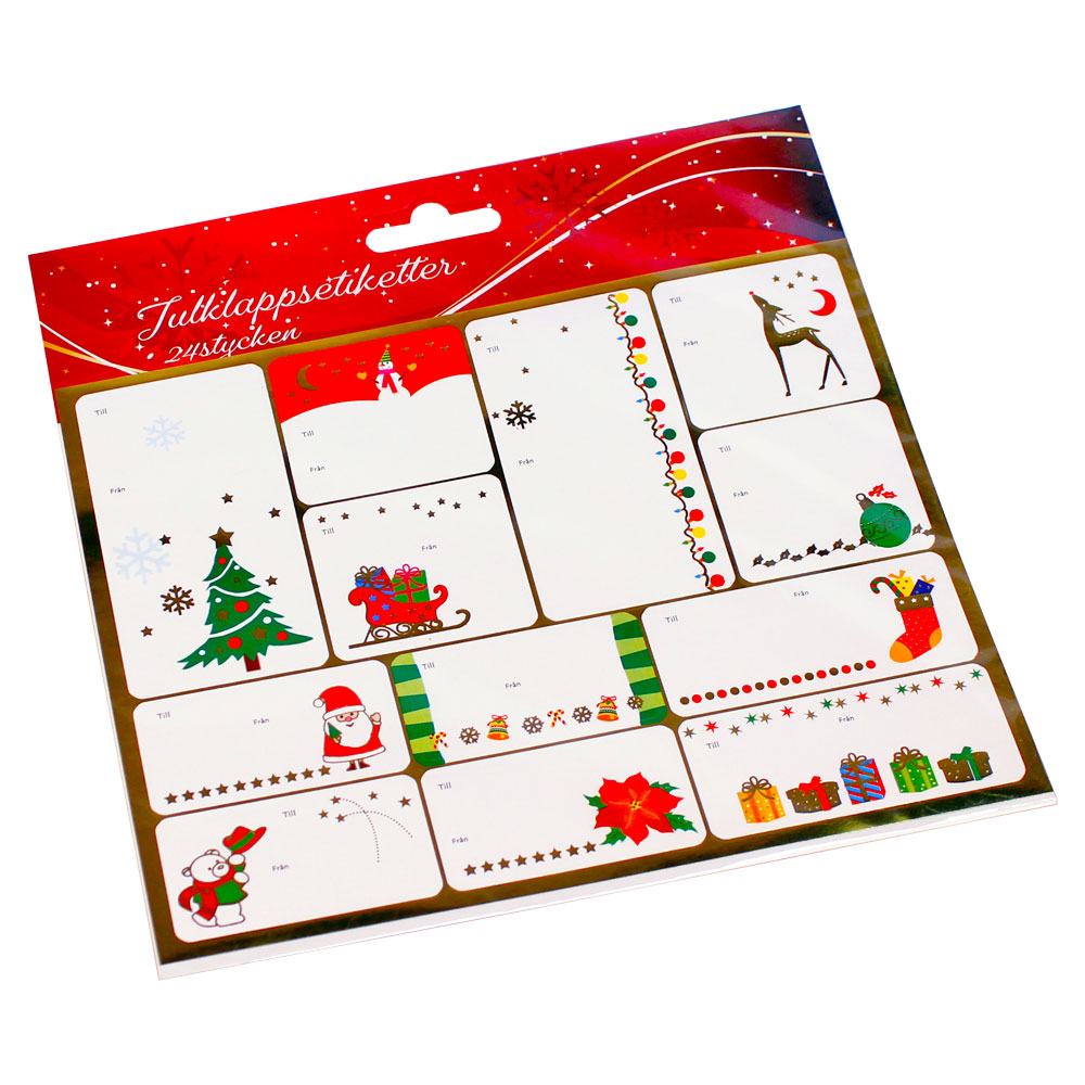 Julklappsetiketter 24-pack omfattar två ark med 24 st julklappsetiketter med olika julmotiv så som julkulor, presenter och tomtar. Arken är ca 15,9 x 20,3 cm stora.
