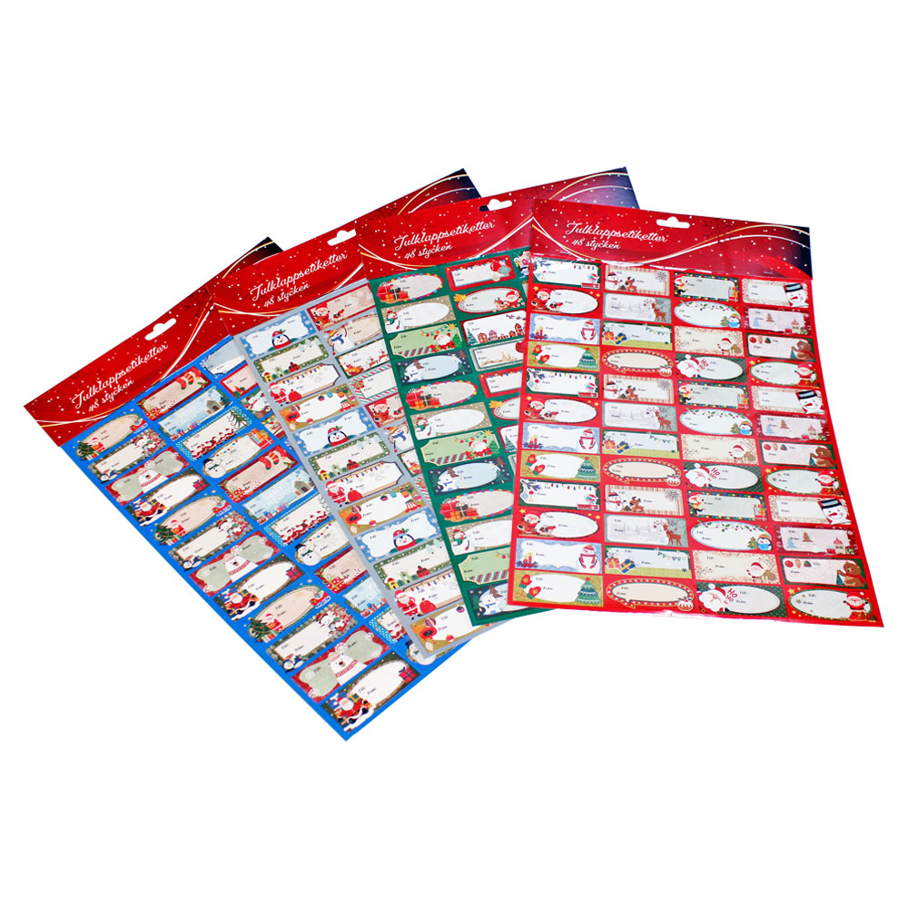 Julklappsetiketter 48-pack omfattar ett ark med 48 st julklappsetiketter i klassisk design. Arket är ca 29 x 40 cm stort och finns i flera olika färger. Vilken färg du får slumpas.