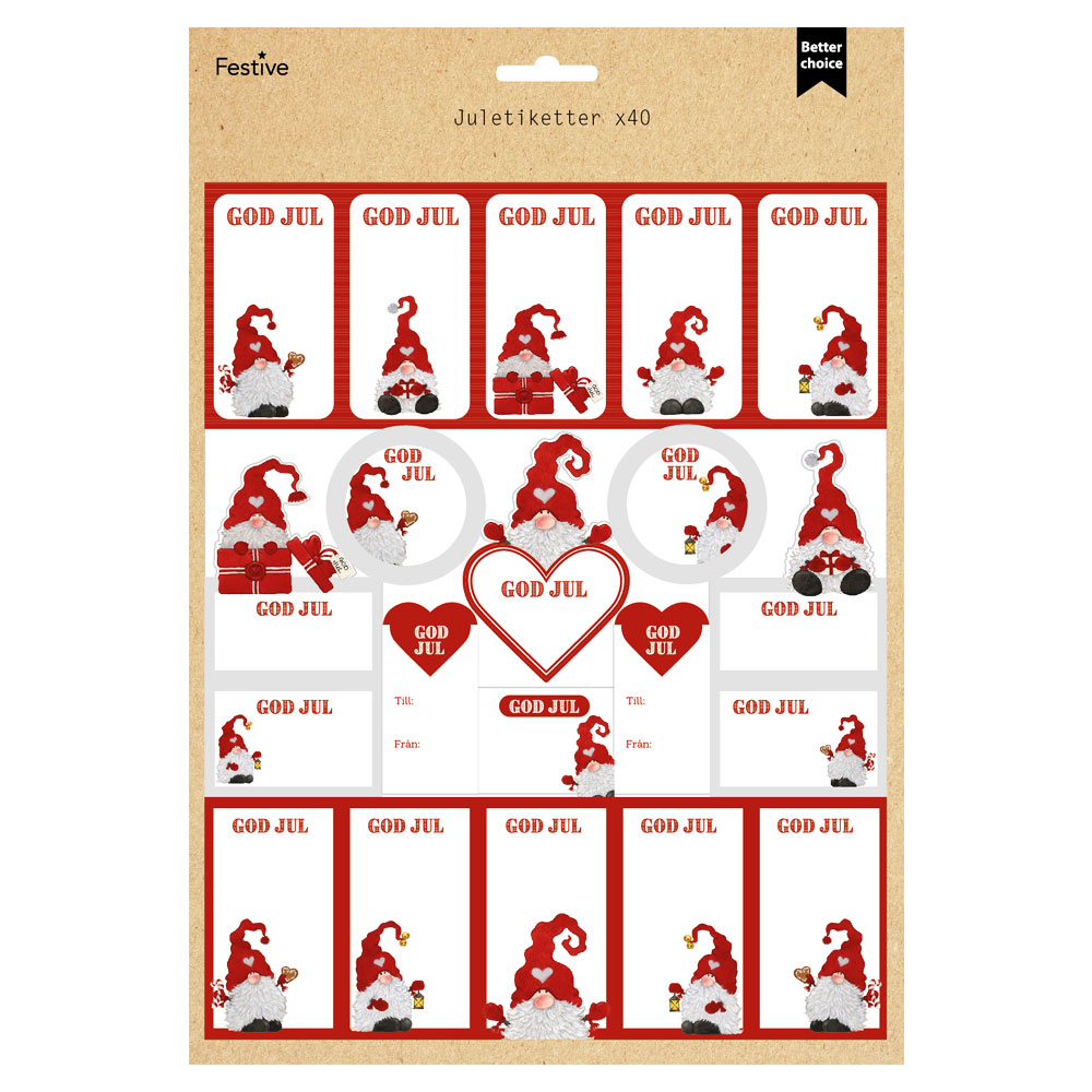 Julklappsetiketter Tomtar 40-pack omfattar 40 st julklappsetiketter med söta tomte motiv och fina "God Jul" texter. Etiketterna är i papp och kommer på ark som mäter ca 27 x 22 cm.