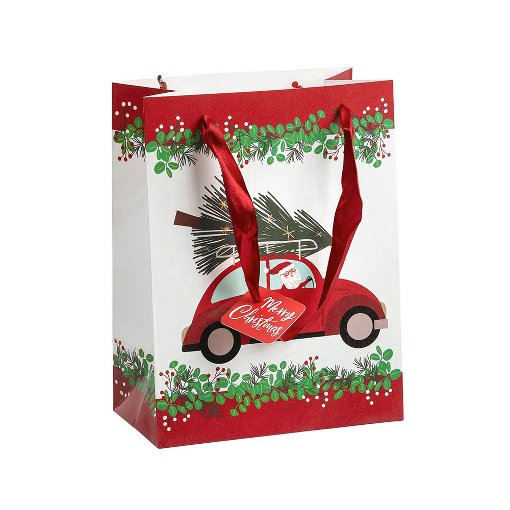 Julklappspåse Julbil Liten omfattar en röd och vit presentpåse av papp med motiv av lingonris och en tomte i en röd bil med en julgran på taket. Presentpåsen är ca 23 x 17,5 x 10 cm stor och har röda handtag samt en etikett med texten "Merry Christmas".