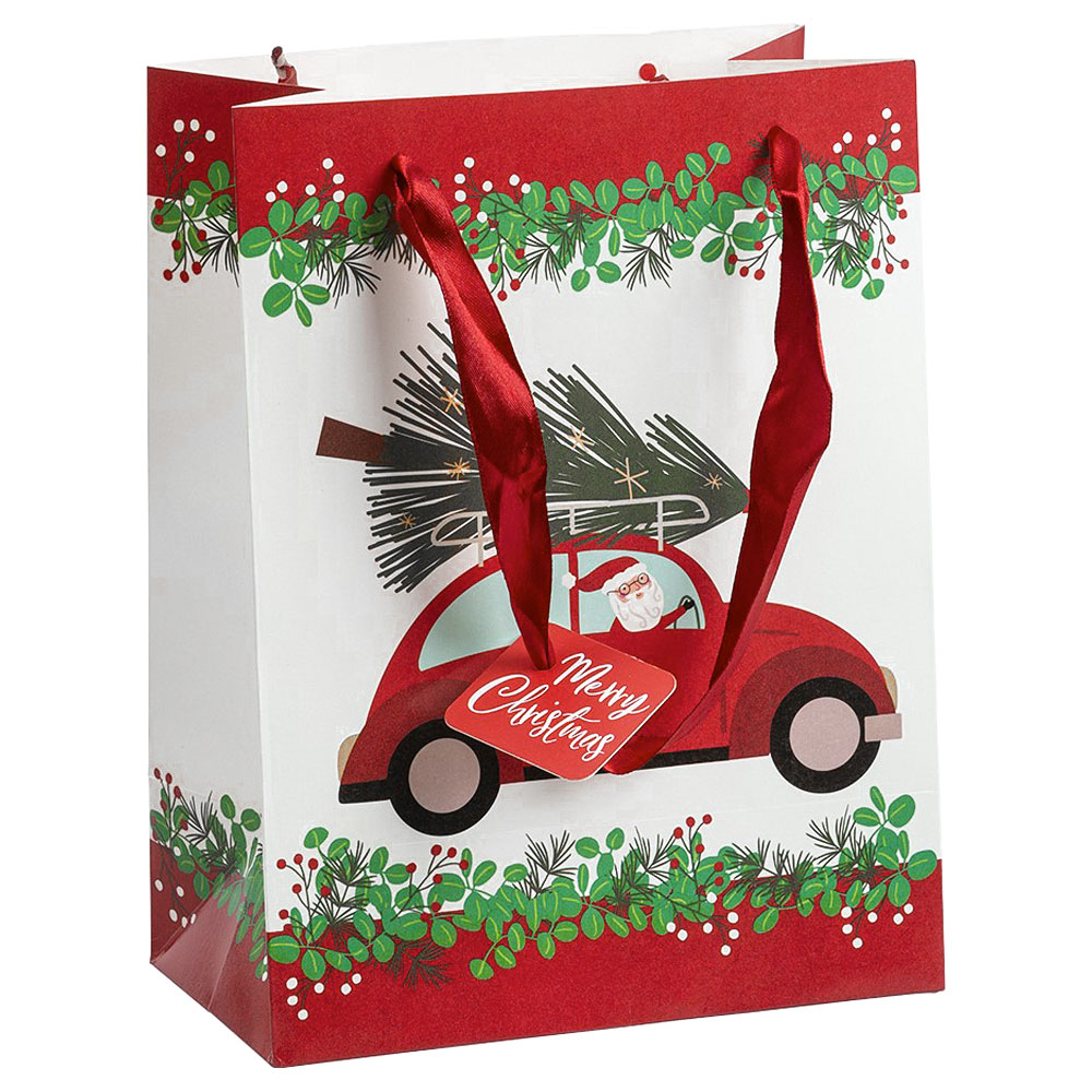 Julklappspåse Julbil Stor omfattar en röd och vit presentpåse av papp med motiv av lingonris och en tomte i en röd bil med en julgran på taket. Presentpåsen är ca 35 x 27 x 11 cm stor och har röda handtag samt en etikett med texten "Merry Christmas".