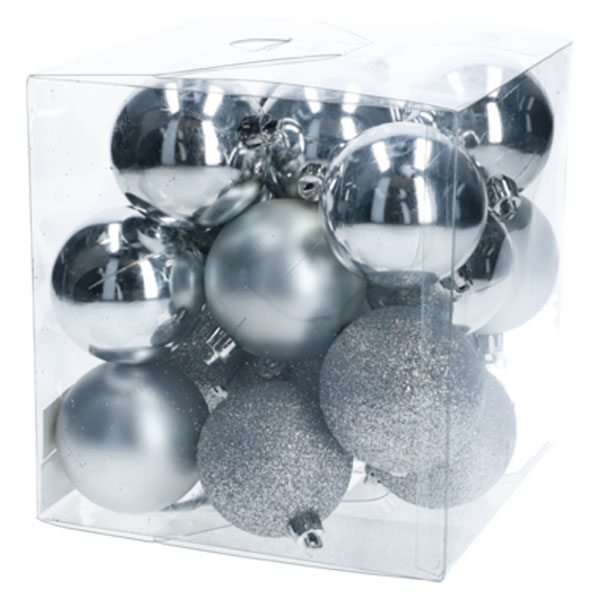 Julkulor Silver omfattar ett 20-pack med diverse julgranskulor i plast med en silvrig färg i olika motiv då den innehåller: