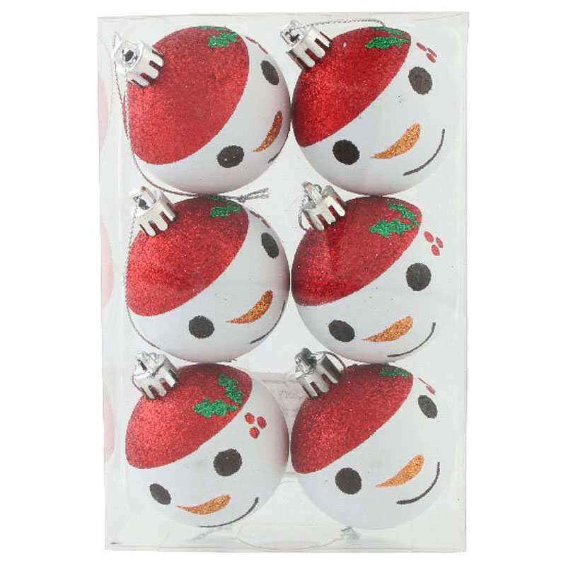 Julkulor Snögubbe omfattar sex stycken matta vita julkulor som ser ut som ett snögubbe huvud med detaljer i färgat glitter. Kulorna har en diameter på ungefär 4,5 centimeter och är tillverkade i plast.