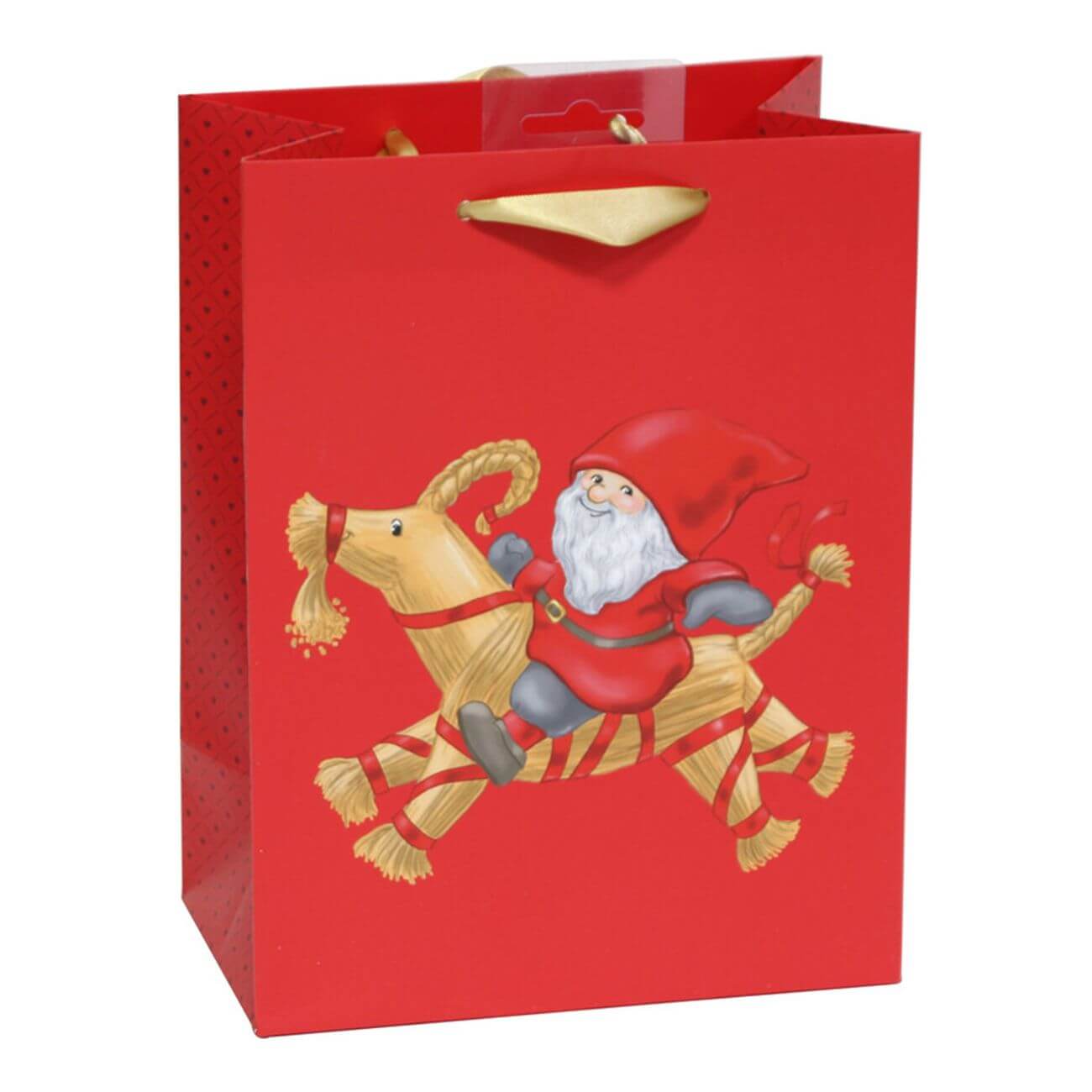 Denna påse pryds av en tomte och julbock på röd bakgrund med guldfärgade sidenband som handtag.