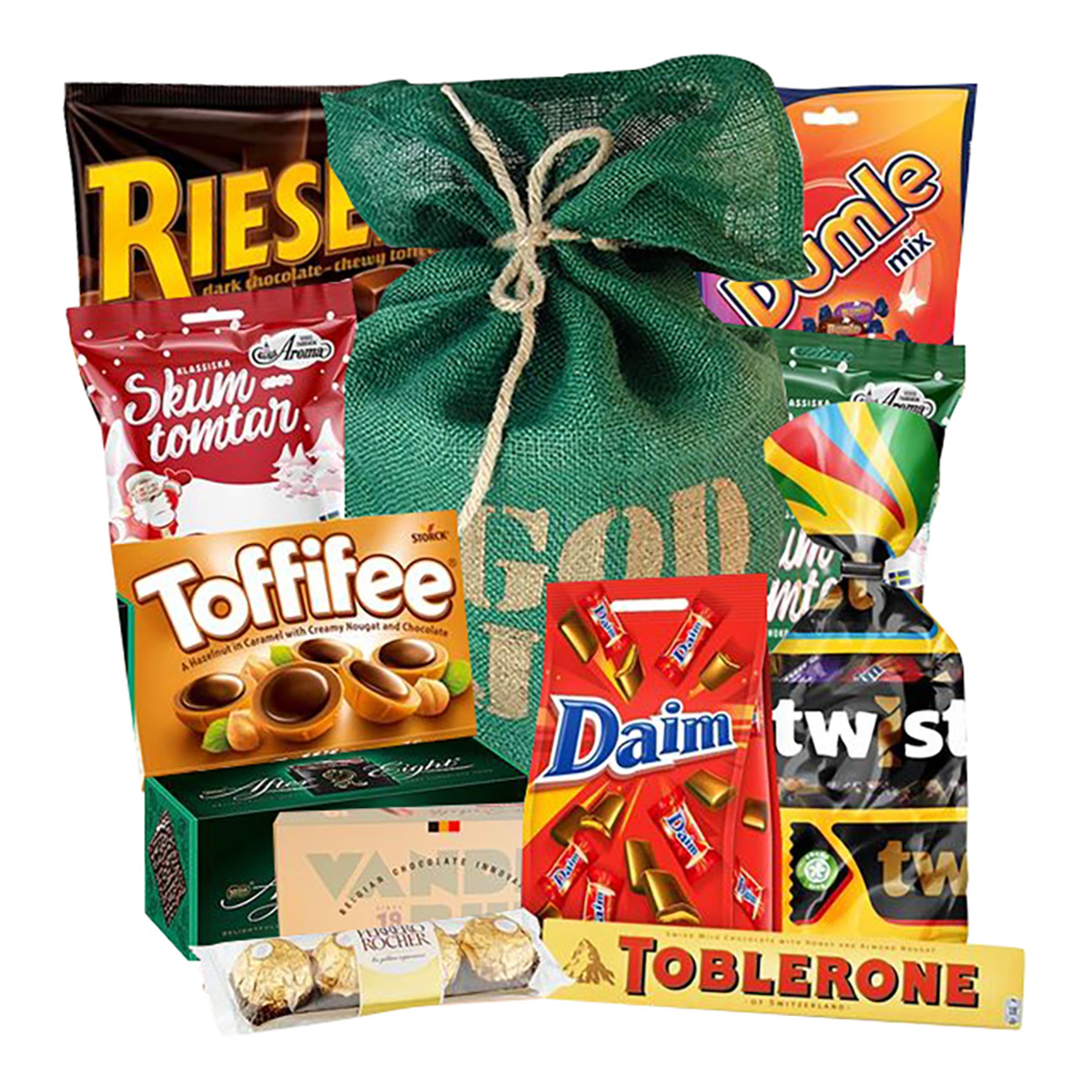 Julsäck med Godis och Choklad Grön är en dekorativ godispåse i form av en jutesäck som kommer proppad med mängder av smaskigt julgodis, choklad och tryfflar i alla dess former. Säcken innehåller hela 1450 gram (!) godis.