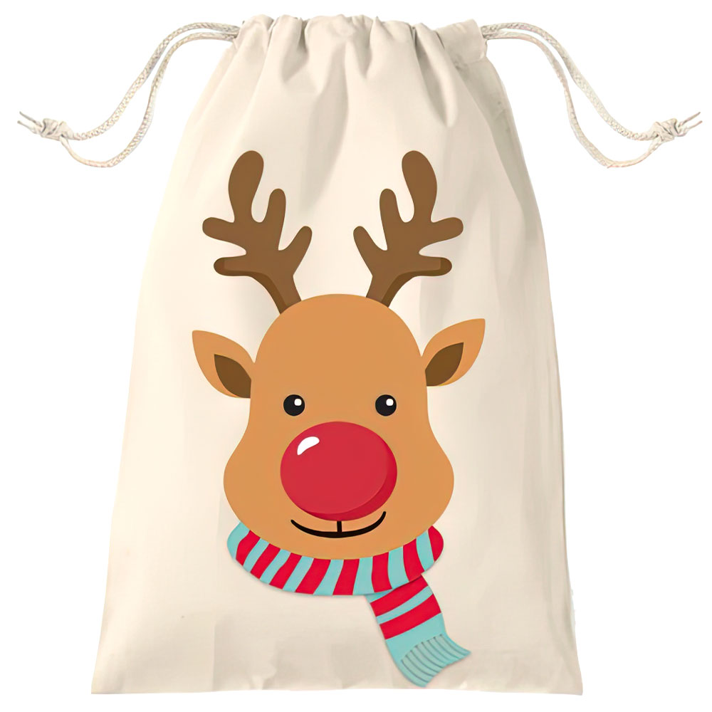 Julsäck Renmotiv omfattar en beige julklappssäck av polyester med fint renmotiv framtill. Säcken är ca 50 cm bred och 80 cm lång och är försedd med dragsnören upptill för att öppna och stänga.
