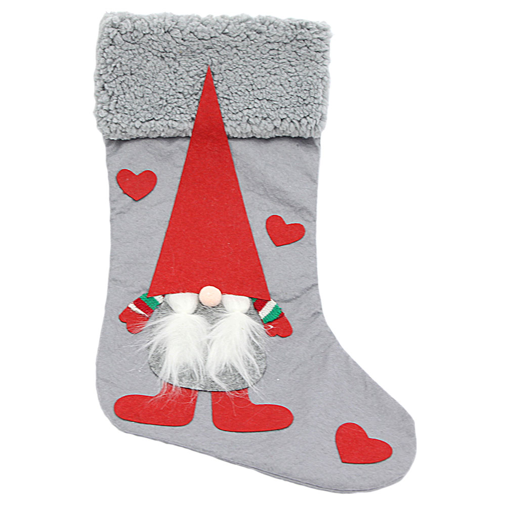 Julstrumpa med Tomte Grå omfattar en julstrumpa i grått filtliknande tyg med fastsytt utstickande motiv av en detaljrik tomte i vitt, grått, rött och grönt, röda hjärtan och en grå fluffig topp.