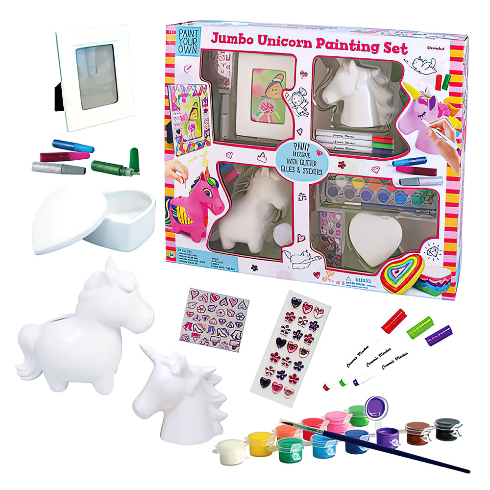 Jumbo Målar Set Enhörning omfattar ett stort måleripyssel set för barn över 3+ år. Settet innehåller en fotoram, en enhörningsspargris, en enhörningspennhållare och en smyckesask av porslin. Medföljer även målarfärger, målarpenslar, färgpennor, glitterlim och stickers.