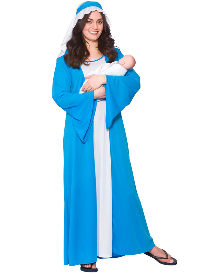 Jungfru Maria Maskeraddräkt omfattar en blå långklänning med vita detaljer, med långa utsvängda ärmar, tillkommer gör en huvudbonad med ett band som är blått runt ett vitt tyg som faller ner över huvudet.