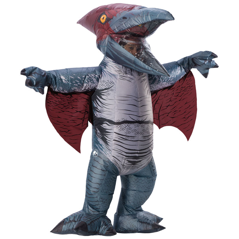 Jurassic World Pteranodon Uppblåsbar Dräkt innehåller en häftig uppblåsbar dinosauriedräkt som föreställer den flygande dinosauren Pteranodon. Dräkten har även en genomskinlig bit i dinosauriens mun som du ser ut genom. Dräkten blåses upp av en inbyggd fläkt som drivs av 4 stycken AA-batterier (batterier ingår ej).