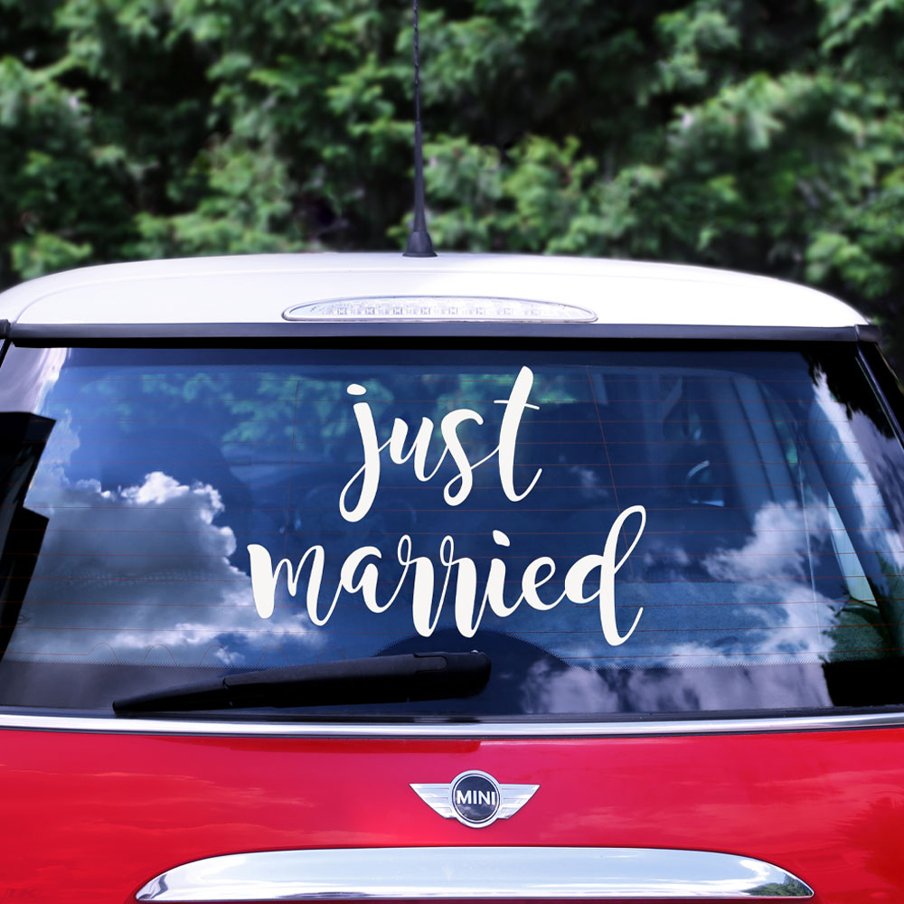 Just Married Bildekal omfattar en bildekal av plast med texten "Just Married" i vitt. Dekalen är enkel att fästa på bilens bakruta eller på plåten, och är även enkel att ta bort. Dekalen är ca 31 cm hög och 43 cm lång.