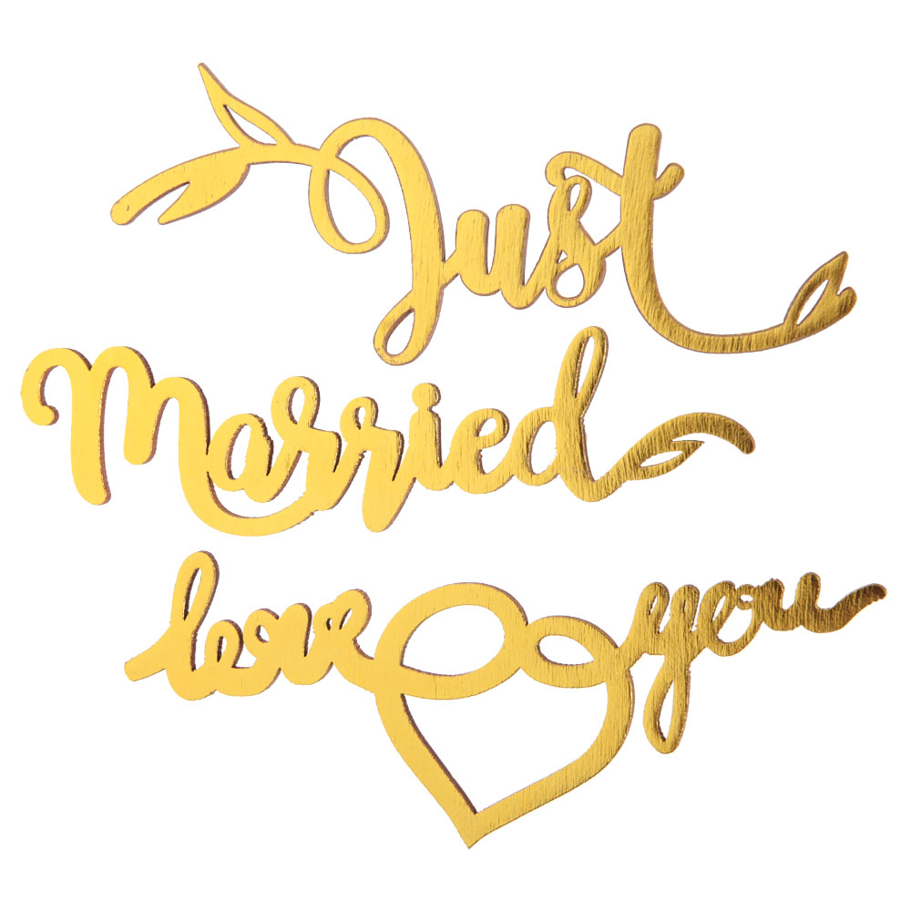 Just Married Bordsdekoration omfattar en guldig bröllopsdekoration i form av texterna "Just Married" och "Love You". Dekorationerna är tillverkade av trä och är ca 13,5 cm långa samt 3 cm breda.