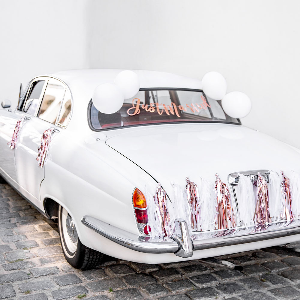 Just Married Bröllopsbil Set omfattar ett bröllopsbilset med dekorationer i vitt och roséguld. Setet innehåller en "Just Married" girlang, 2 tofs-girlanger, 10 vita latexballonger, ett vitt satinband och ett transparent snöre samt sugproppar att fästa dekorationerna med. Dekorationerna är tillverkade av plast, papp och latex. Passar till de flesta bilar.