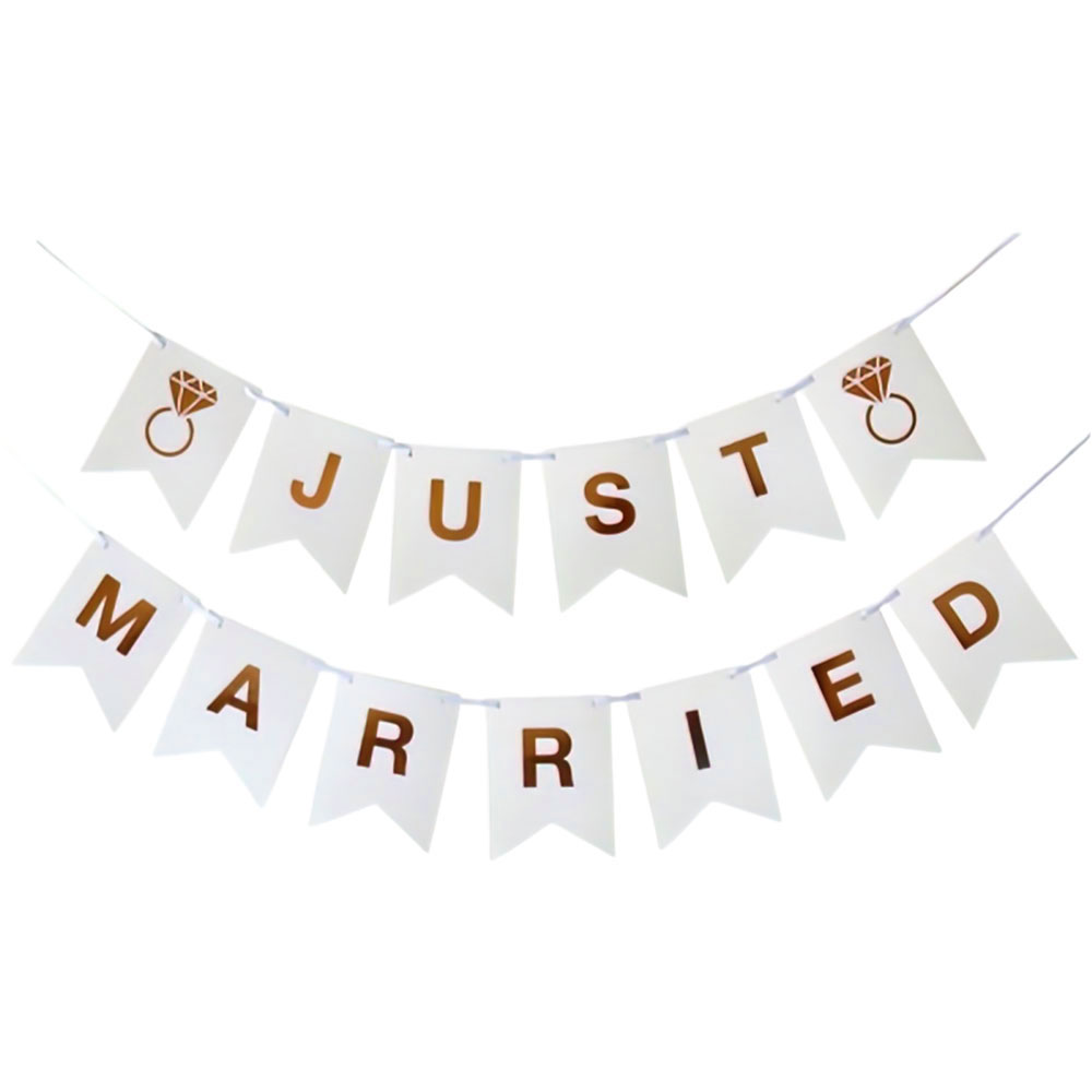 Just Married DIY Flaggirlang omfattar ett bröllopsgirlang set. Setet innehåller ett vitt, 3 meter långt snöre samt 13 st vita pappflaggor med roséguldiga diamantmotiv och bokstäver som bildar texten "Just Married". Flaggorna är ca 18 x 13,5 cm stora och träs enkelt på snöret.