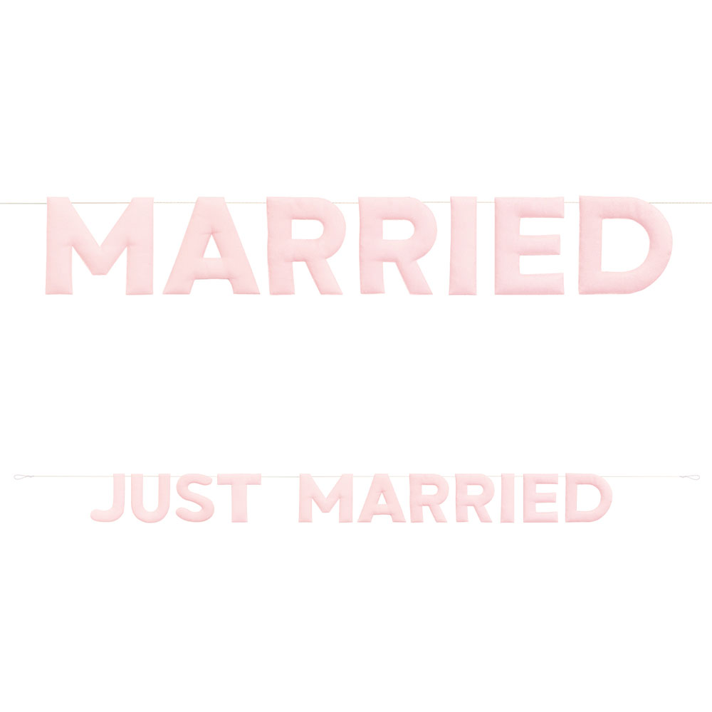 Just Married Girlang i Tyg Rosa omfattar en girlang med elva bokstäver i pastellrosa av tygmaterial, som tillsammans bildar texten "JUST MARRIED". Ett vitt snöre medföljer för enkel upphängning.