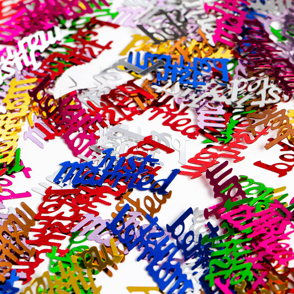 Just Married Konfetti Flerfärgad omfattar 14 gram flerfärgat konfetti i form av texten "Just Married".