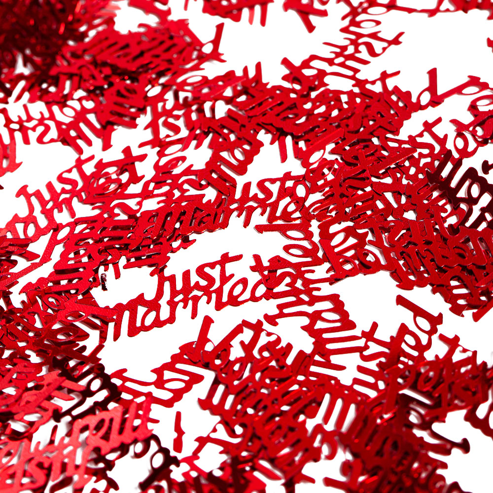 Just Married Konfetti Röd omfattar 14 gram rött konfetti i form av texten "Just Married".