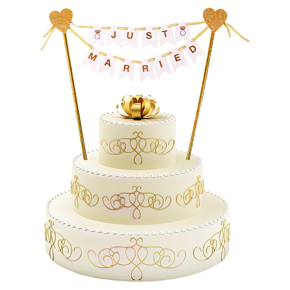 Just Married Tårtdekoration Flaggirlang omfattar en vit och guldig tårtdekoration i form av en mini flaggirlang med texten "Just Married" på framsidan. Dekorationen är tillverkad av papp och är ca 25 cm hög.