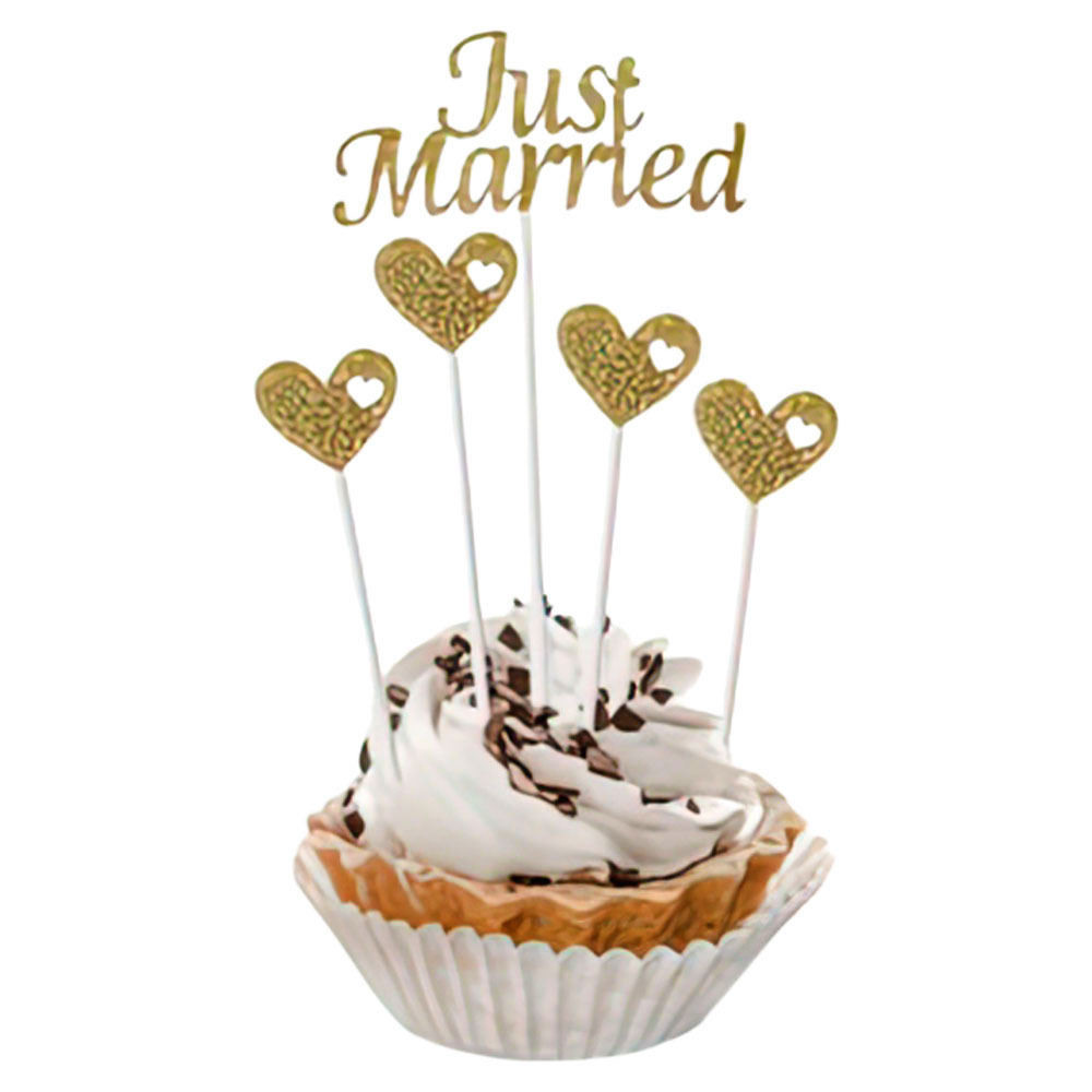 Just Married Tårtdekorationer Guld omfattar en tårtdekoration i form av texten "Just Married" och 4 stycken tårtdekorationer i form av hjärtan. Tårtdekorationerna är tillverkade av papp och plast, och är ca 11-17 cm långa.