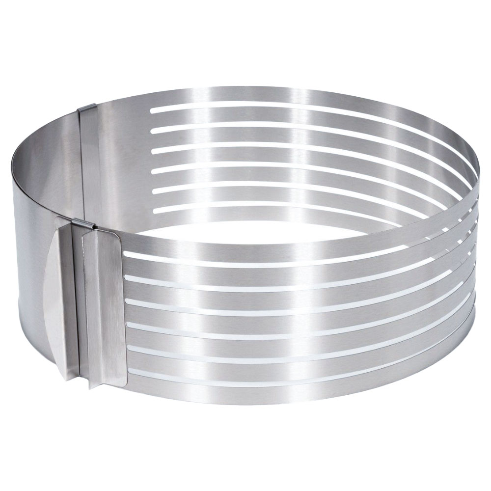 Justerbar Tårtbottenskärare omfattar en tårtbottenskärare av rostfritt stål med 7 skåror. Tårtringen är justerbar och mäter ca 24-30 cm i diameter.