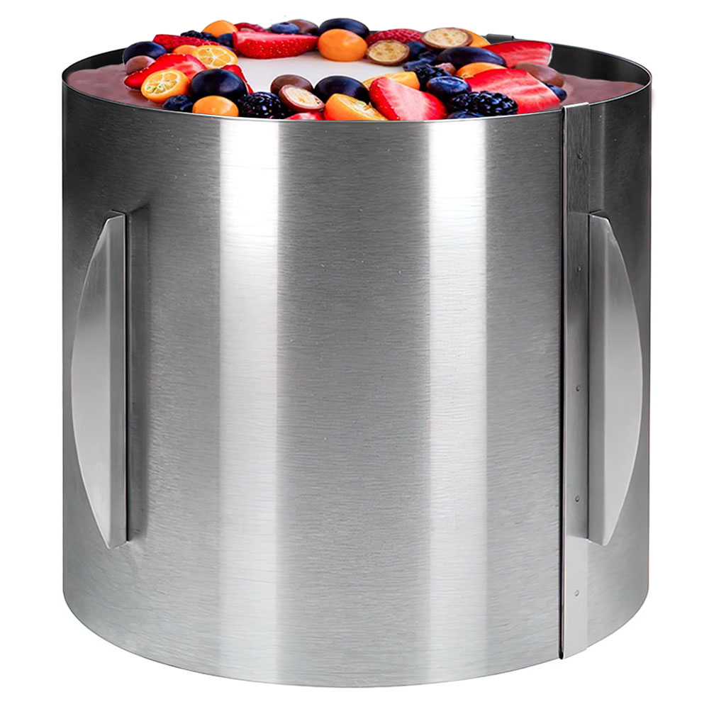 Rund, ställbar tårtring med hög kant som låter dig skapa festliga tårtor i många olika storlekar! Denna tårtring kan du alltså enkelt justera i precis den storlek du önskar så den passar perfekt till just dina tårtor. Den kan dessutom användas som tårtform att baka tårtan i, perfekt för dig som söker både tårtform och tårtring i exakt samma storlek. Med en justerbar tårtring som denna kan du med andra ord vara helt säker på att tårtorna blir riktigt fina!