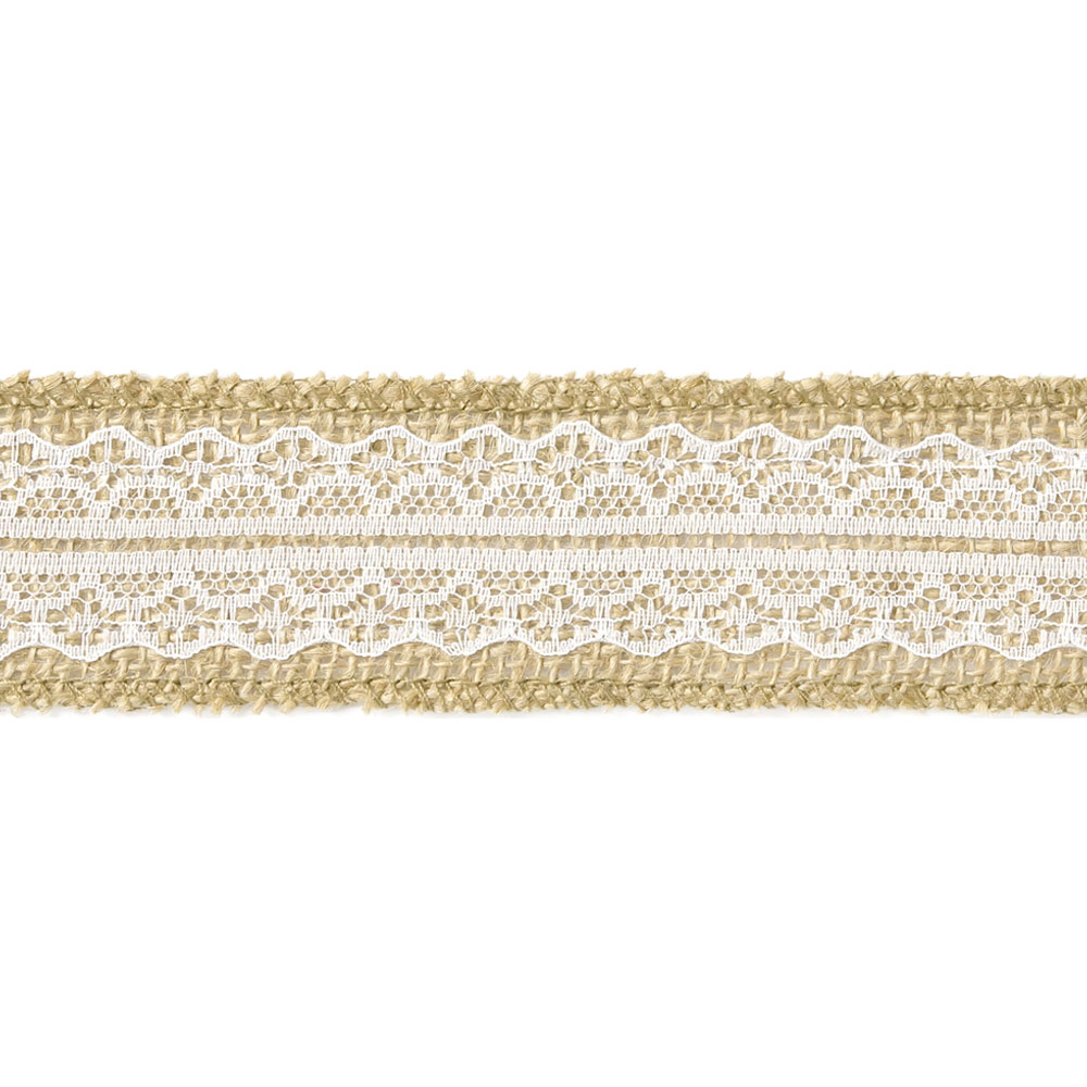 Juteband med Spets omfattar ett naturfärgat dekorationsband av jute med vit spets. Bandet kommer på en smidig rulle och är ca 4 cm brett och 5 meter långt.