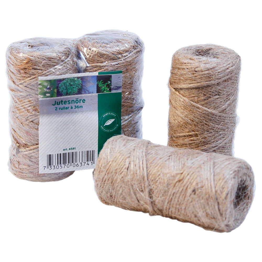 Jutesnöre består av ett tvinnat natursnöre. En rulle mäter 36 meter lång. Tillverkat av jute. Säljs i 2-pack.