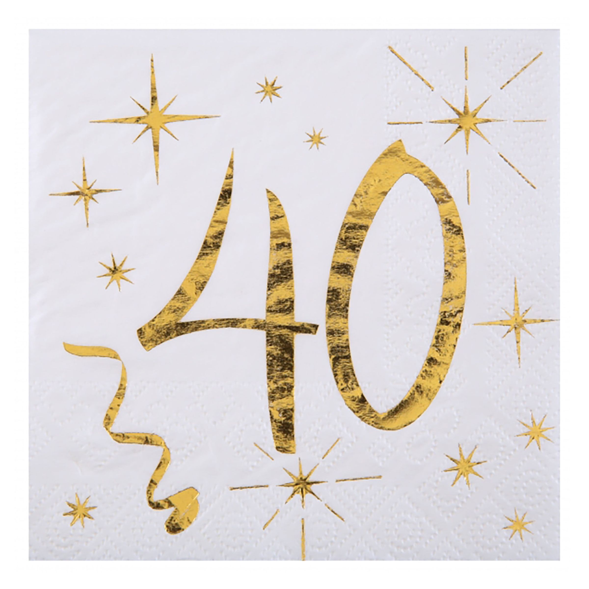 Kaffeservetter 40 Guld är vita pappersservetter med siffran "40" skrivet i guld, omringat av små stjärnor – perfekt till 40-årskalaset. Servetterna har tre lager och mäter 33 x 33 centimeter utvikta.