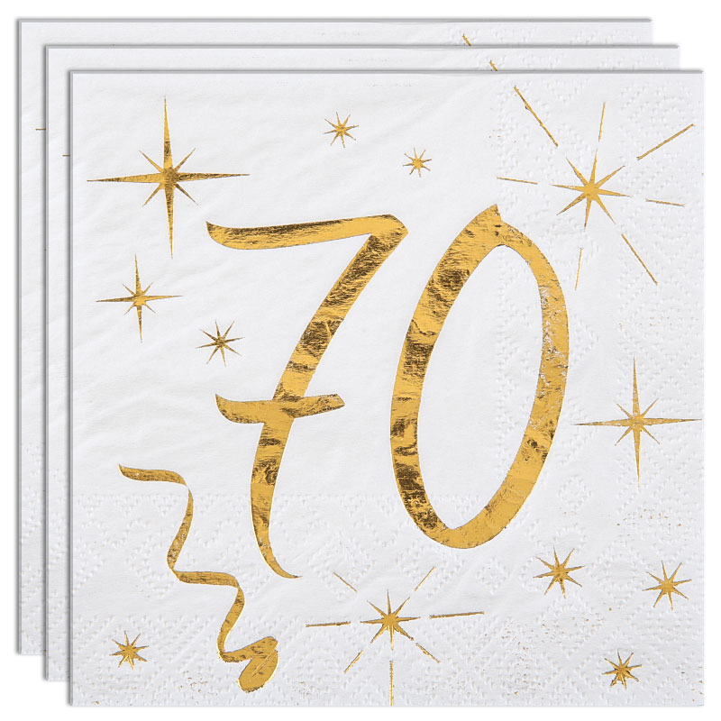 Kaffeservetter är ett måste till varje dukning och dessa snygga 70-års servetter passar helt perfekt för dig som vill fira din födelsedag i fina nyanser av vit och guld. Duka upp dessa 70-års servetter tillsammans med matchande tillbehör och få genast till en riktigt fin dukning till din 70-års fest. Toppenfina servetter för alla som ska fylla 70 år och bjuder in till kalas!