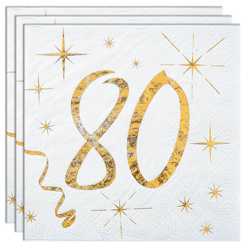 Fina servetter för dig som ska fylla 80 år! Med dessa servetter i vit och guld kan du enkelt få till en riktigt stilfull dukning till din födelsedag. Med andra ord perfekta kaffeservetter för dig som vill skapa en riktigt fin födelsedagsdukning i lyxigt vitt och guld.