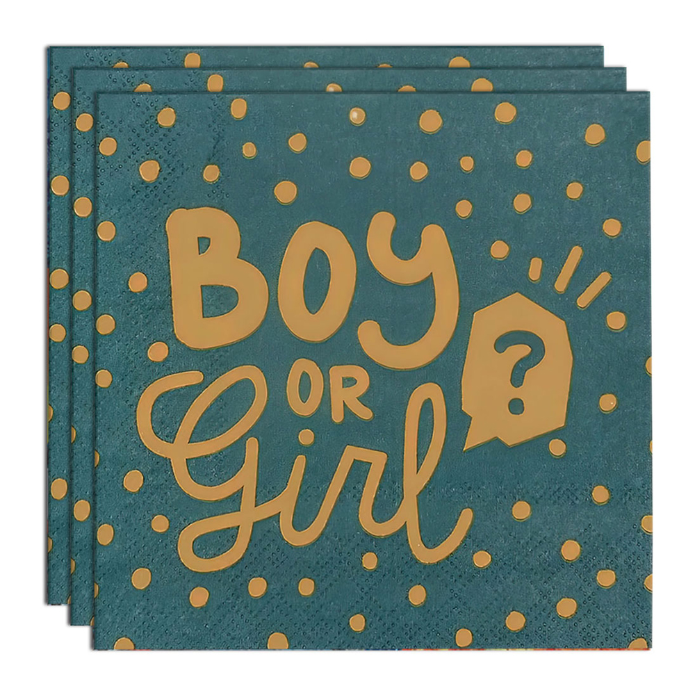 Kaffeservetter Boy or Girl omfattar ett 12-pack med små mörkblå pappersservetter med 2 lager och "Boy or Girl?" text i glansigt guld på ena sidan och i gult på andra. Servetterna är biologiskt nedbrytbara och mäter ca 25 x 25 cm utvikta.