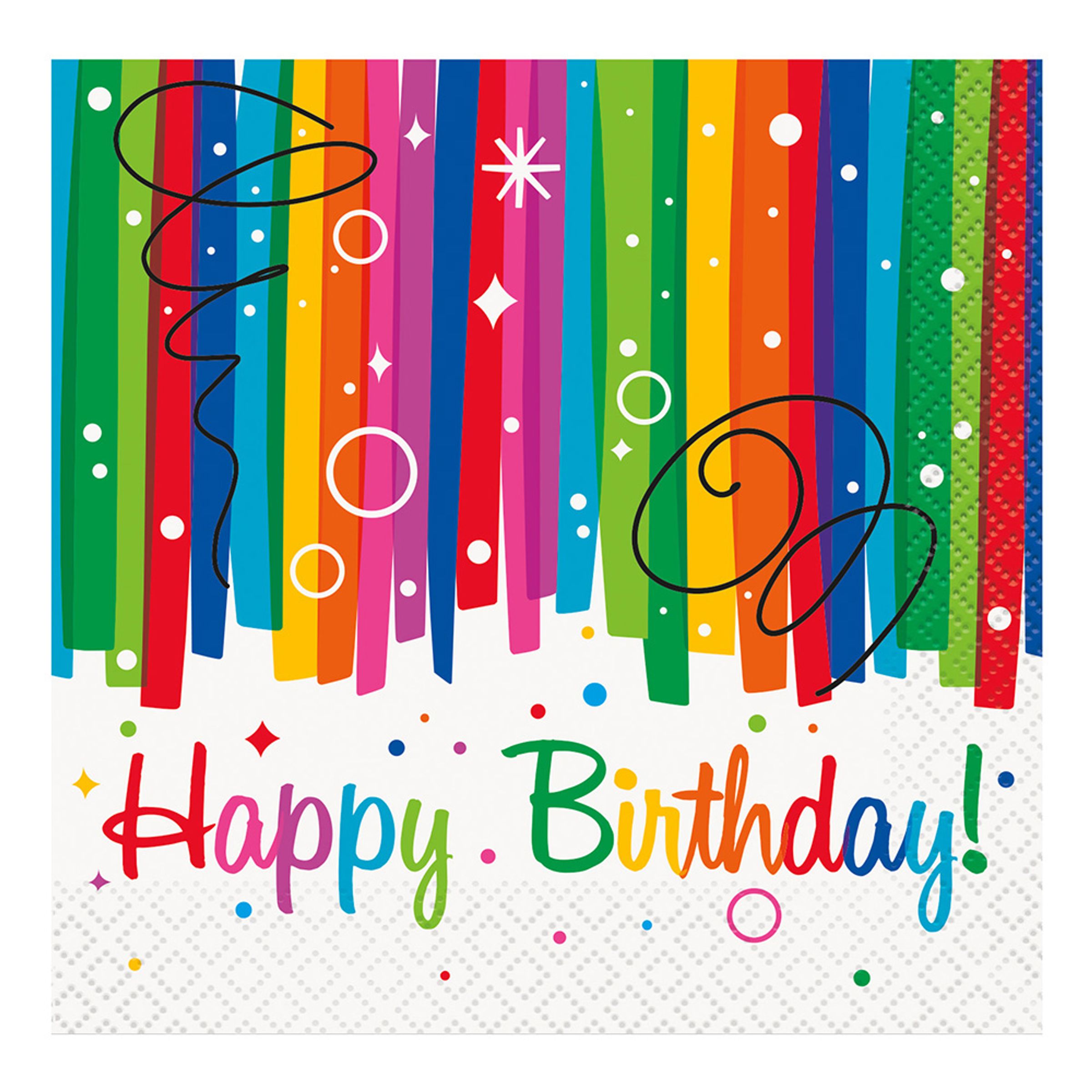 Kaffeservetter Happy Birthday Regnbåge är ett 16-pack servetter med motiv av färgglada ränder, konfetti och texten "Happy birthday". Servetterna består av 2st tunna lager papper med god uppsugningsförmåga.