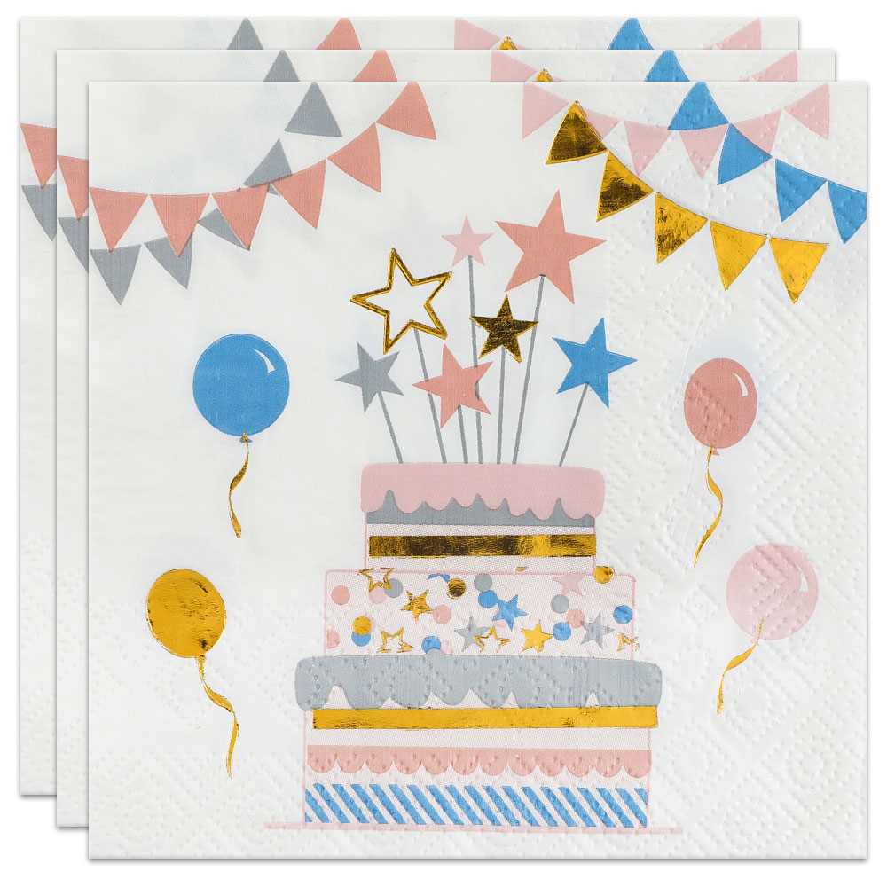 Kaffeservetter Kitty Party omfattar ett 20-pack vita kaffeservetter med guld- och pastellfärgat motiv av en födelsedagstårta, flaggirlanger och ballonger. Servetterna mäter ca 25 x 25 cm utvikta.