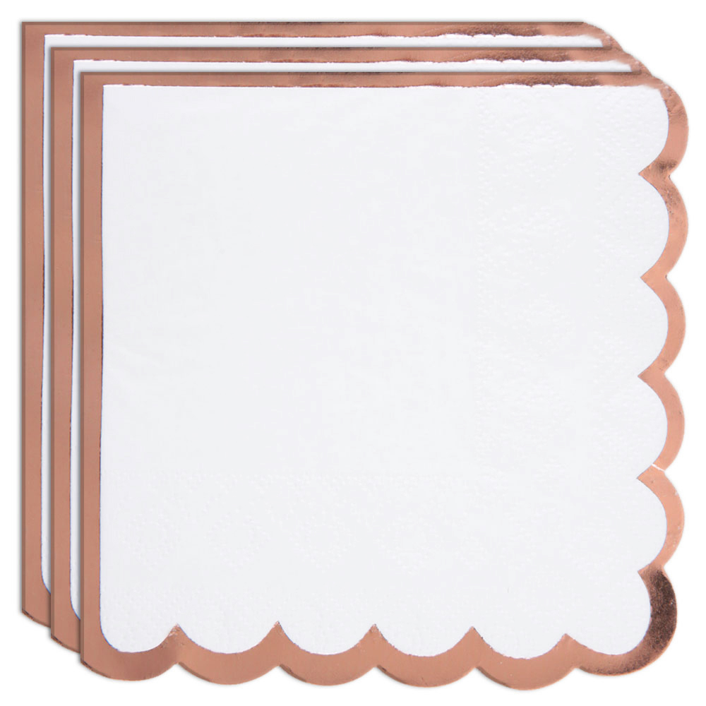 Kaffeservetter Scalloped Roseguld omfattar vita kaffeservetter med kanter i skimrande roseguld. Servetterna kommer i 20-pack och mäter ca 25 x 25 cm utvikta.