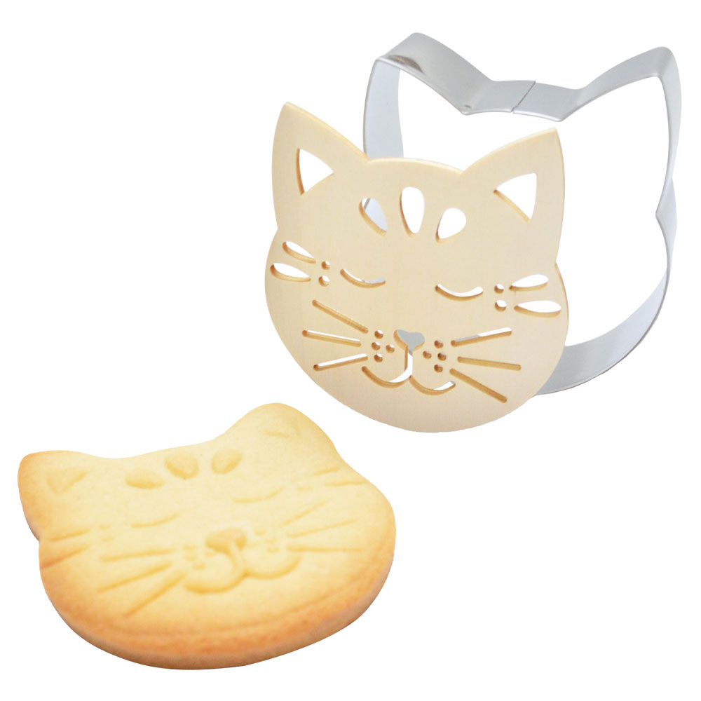 Kakform med Stämpel Katt omfattar en kakform i form av ett katthuvud i rostfritt stål med hålig och mönstrad träplatta inuti. Kakformen är ca 7 cm lång och 6,5 cm bred.