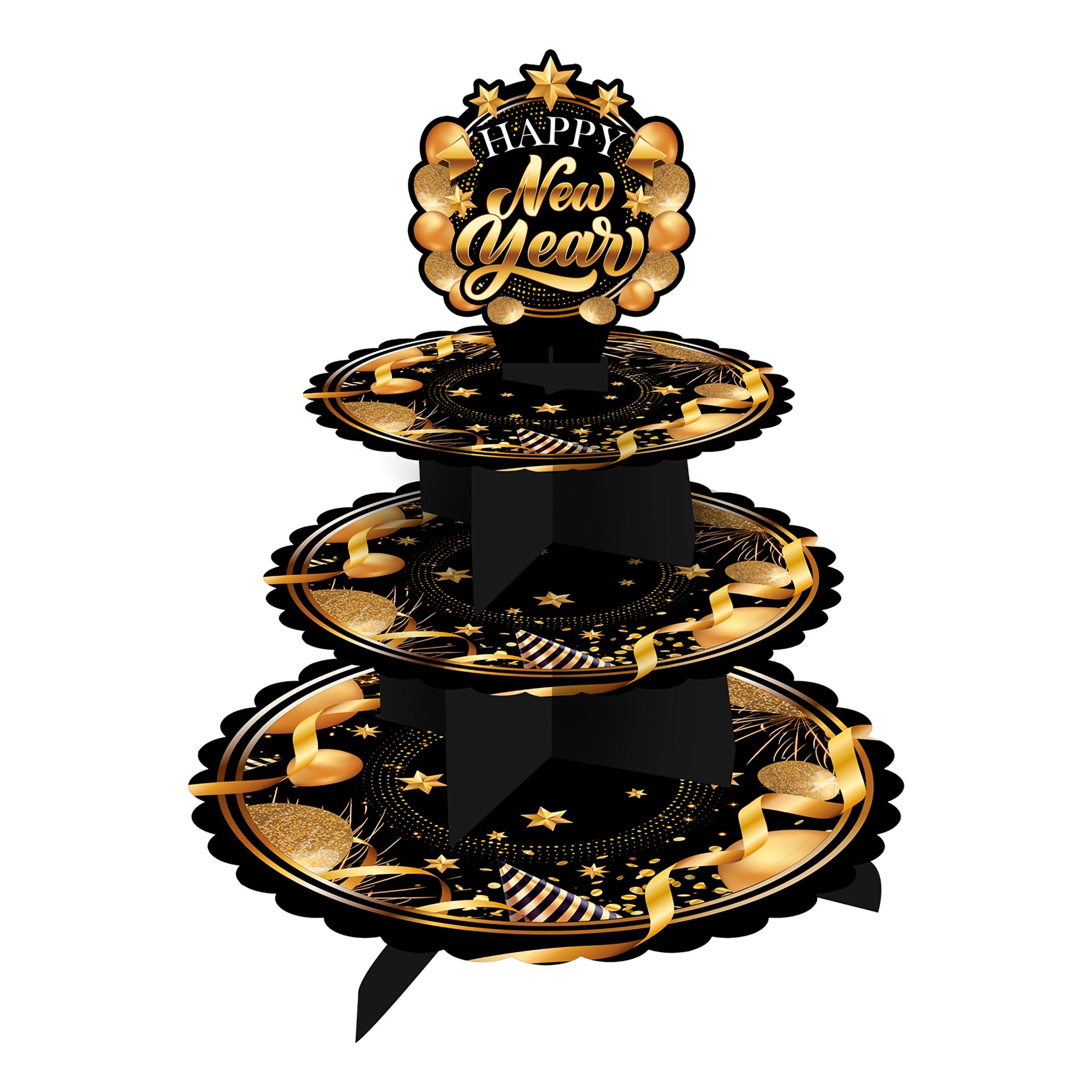 Kakställ Happy New Year är ett kakställ i 3 lager som kommer med ett festligt nyårsmotiv i guld och svart som passar utmärkt för att servera såväl bakelser som snittar med på nyårsfesten. Stället kräver enkelt montering.