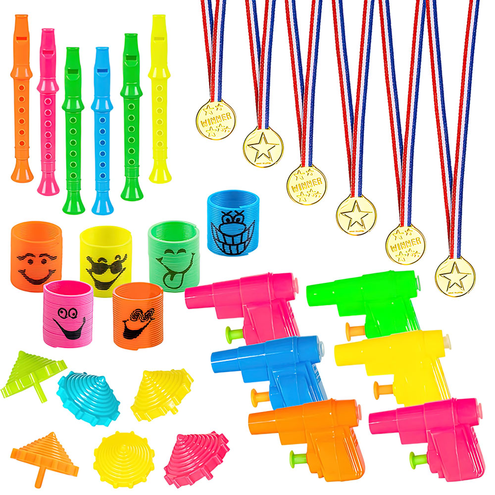 Kalasleksaker Kit omfattar ett kit med 30 stycken små leksaker i plast i olika färger för barn. Kitet innehåller mini flöjter, mini spiraler, mini guldmedaljer och mini vattenpistoler. Rekommenderas för barn från 3 år.