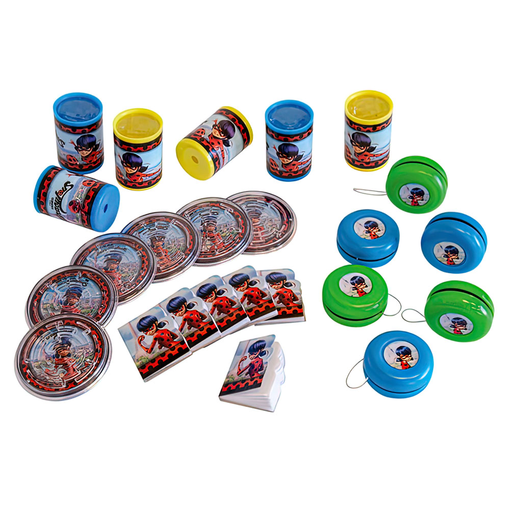 Kalasleksaker Miraculous Ladybug omfattar ett set med 24 stycken olika kalasleksaker med Miraculous Ladybug motiv, inklusive 6 st var av yo-yo, litet kalejdoskop, små anteckningsböcker och labyrintspel.