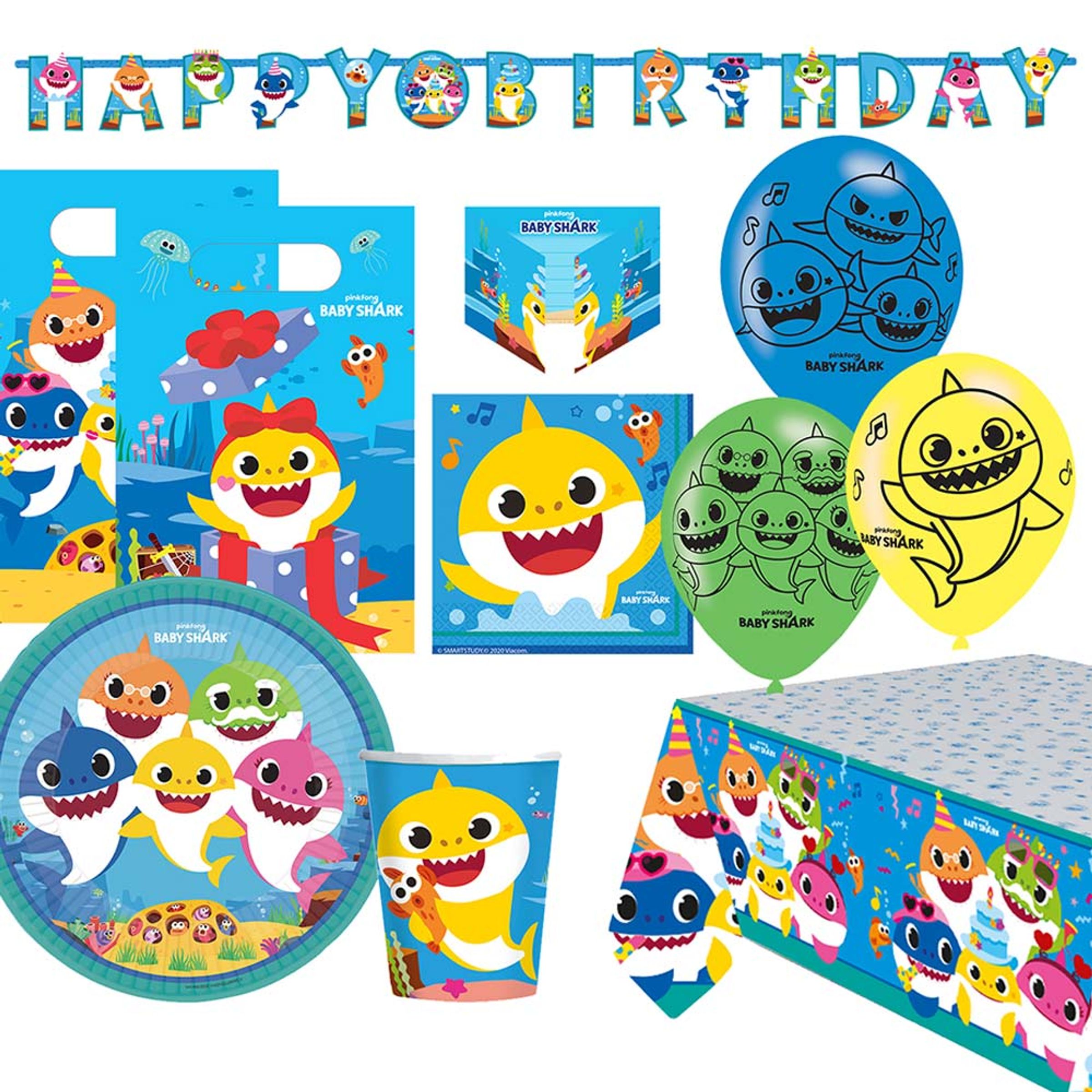 Kalaspaket Baby Shark är ett utmärkt kit perfekt för födelsedagskalaset i gulligt Baby Shark-tema. Paketet innehåller dukningsprylar såsom tallrikar, servetter och muggar samt dekorationer i form av en Happy Birthday-girlang, ballonger, bordsduk och till och med kalaspåsar och inbjudningskort.