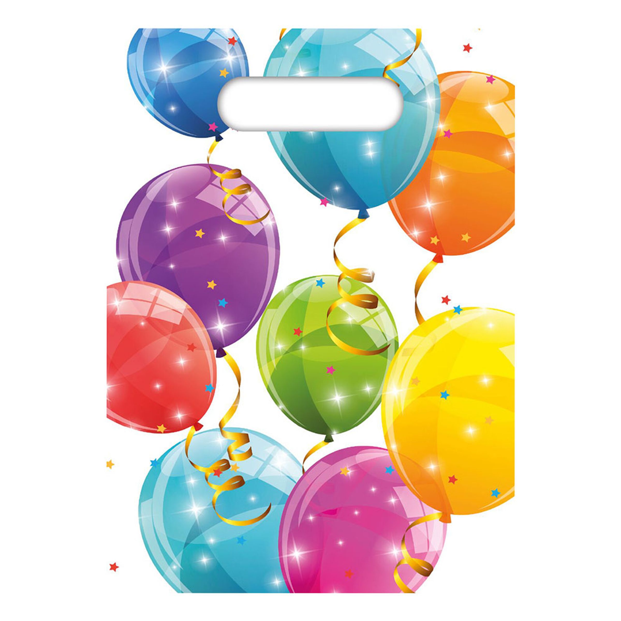 Kalaspåsar Ballonger Skimrande inkluderar sex stycken vita kalaspåsar med ett härligt ballongmotiv. Ballongerna skimrar i olika färger och på påsarna finns även små stjärnor och guldfärgade ballongsnören. Påsarna är tillverkade i plast och har ett smidigt utstansat handtag. De är ca 16 x 23 cm stora.