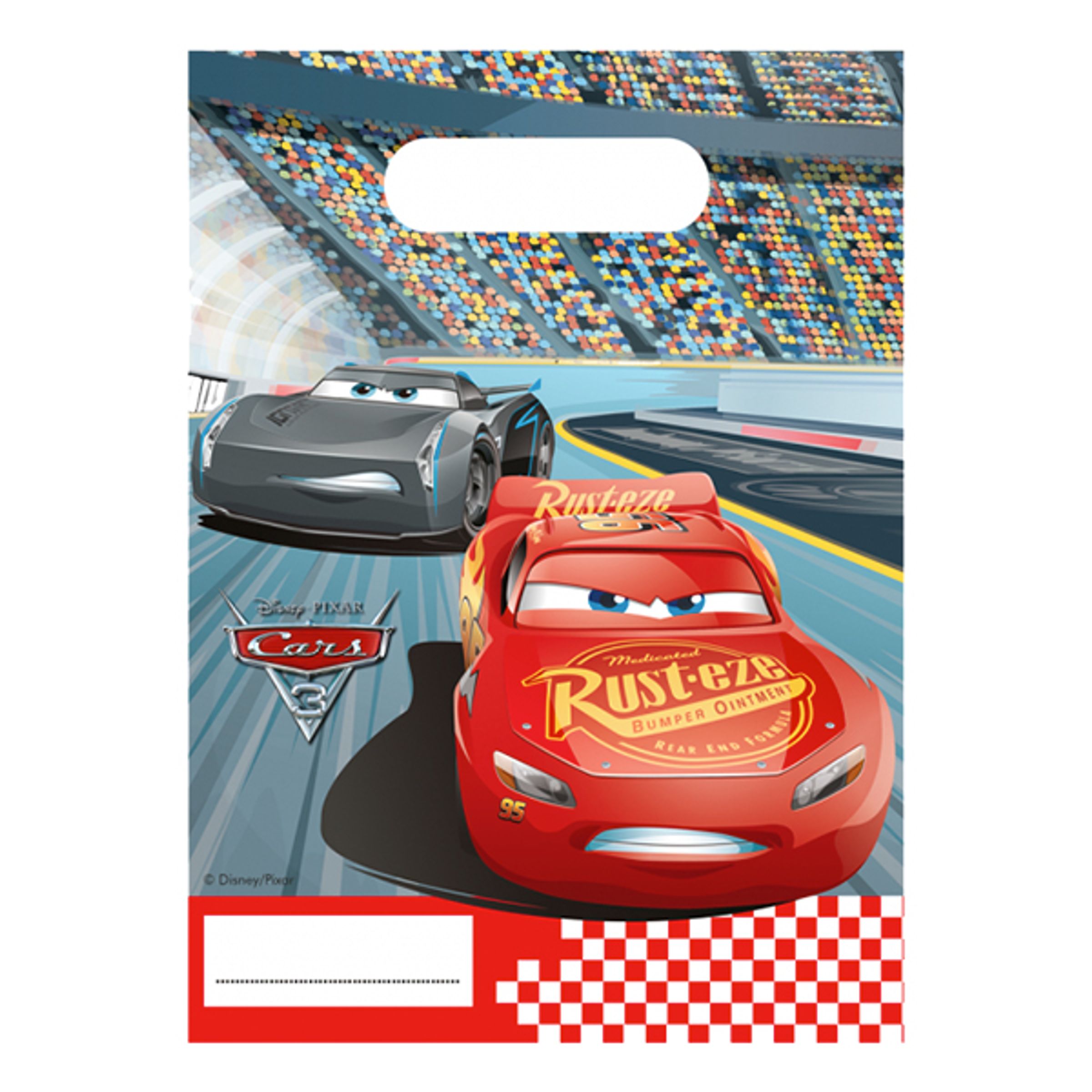 Kalaspåsar Bilar/Cars 3 inkluderar sex stycken kalaspåsar. Kalaspåsarna har ett färgglatt motiv från filmen Bilar med Blixten McQueen. Längst ner på påsen finns en vit ruta där du kan skriva gästernas namn. Påsarna är tillverkade i plast och har ett smidigt handtag. De är 16 x 23 cm stora.