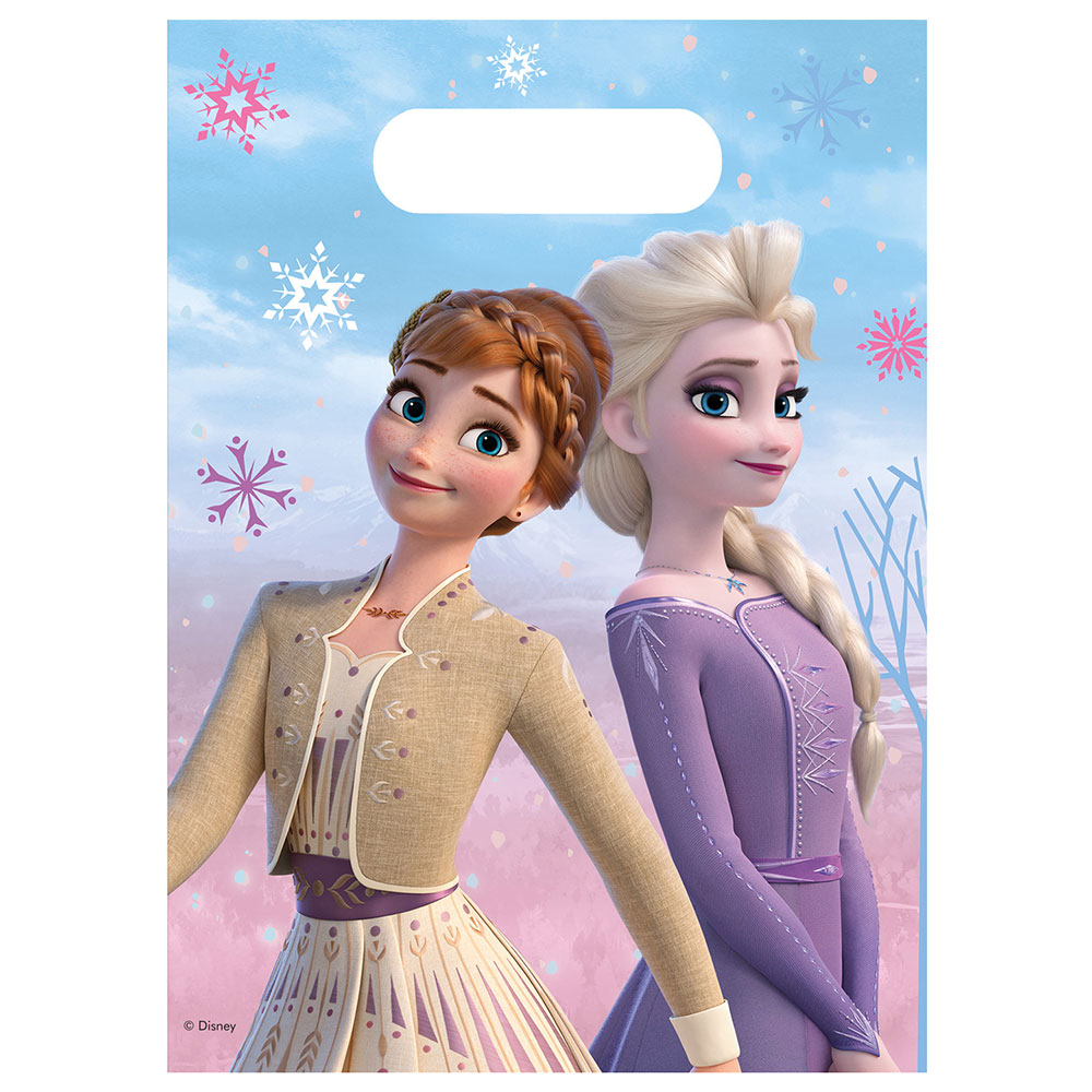 Kalaspåsar Frost 2 Wind Spirit omfattar 6-pack kalaspåsar med Anna och Elsa motiv. Påsarna är i plast och mäter 16,5 x 22,5 cm.