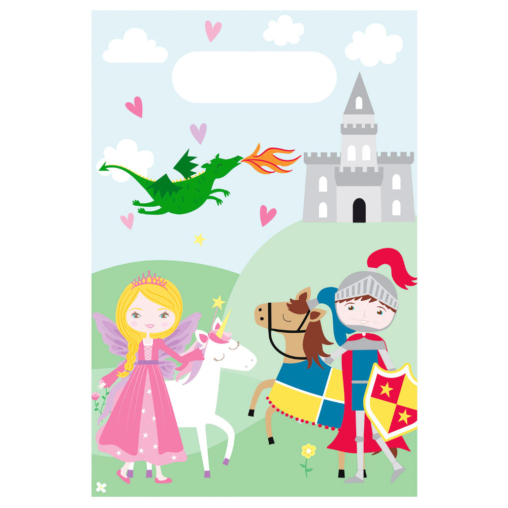 Kalaspåsar Princess och Knight omfattar färgglada kalaspåsar i papper med motiv av en prinsessa och en riddare med varsin häst och en flygande drake med hjärtan runtom. Påsarna är ca 23,5 cm höga och 16 cm breda. Säljs i 8-pack.