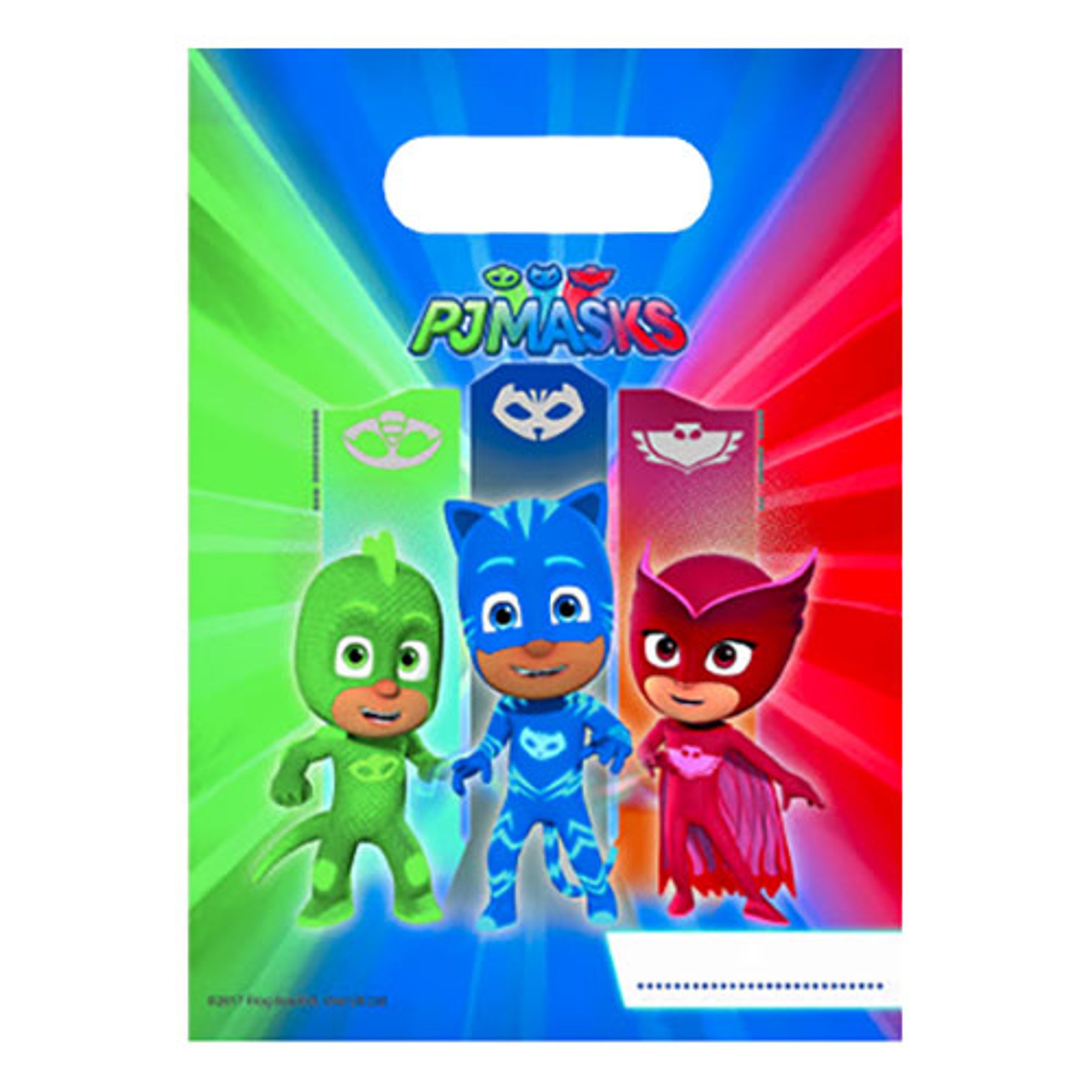 Kalaspåsar Pyjamashjältarna är tillverkade i ett plastmaterial. På påsarna finns ett tryck av karaktärerna från Pyjamashjältarna i rött, grönt och blått. På påsen finns också en streckad linje där du kan skriva mottagarens namn.